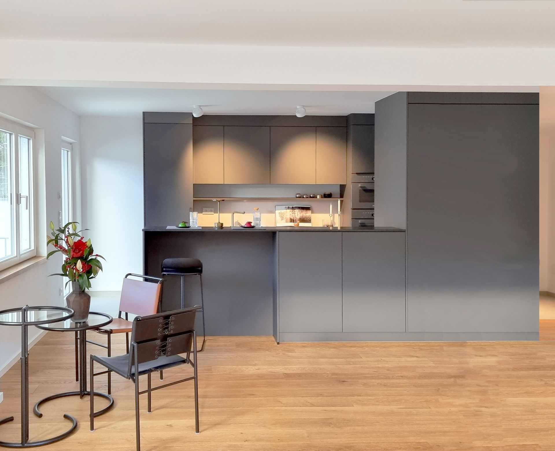 Como pieza de mobiliario, la cocina divide en zonas la sala de estar abierta. Una isla de cocina forma un punto de encuentro comunicativo. Los armarios empotrados compactos están integrados y crean mucho espacio de almacenamiento.