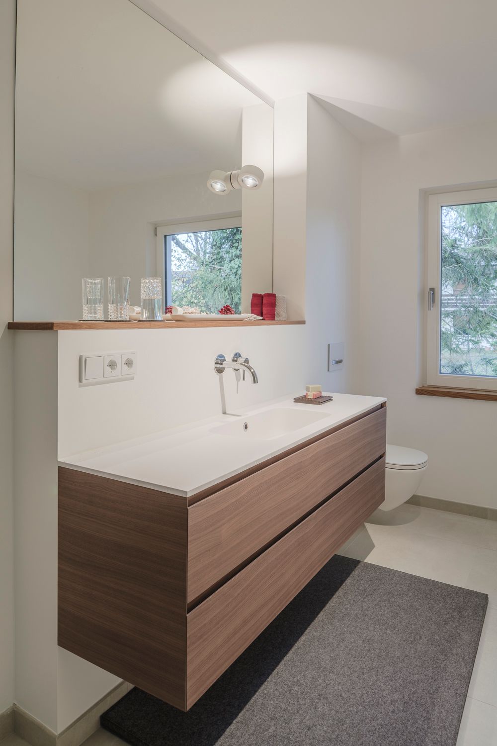Un espacioso baño para los padres con una lujosa bañera, un baño de bienestar con sauna y un aseo de invitados (como ducha adicional) encuentran su nuevo lugar en la casa.